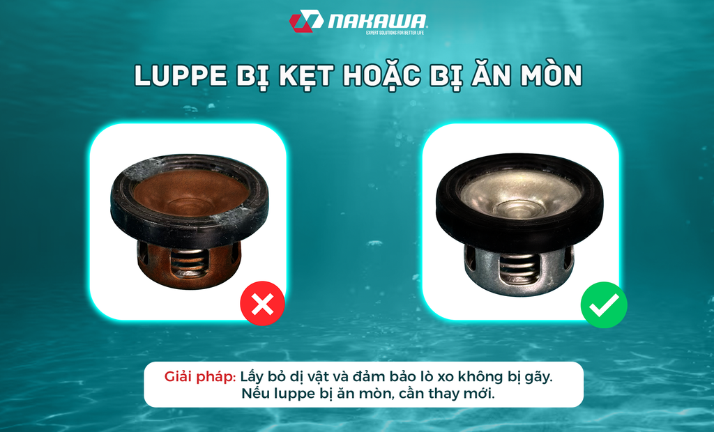 Nguyên nhân: Cặn bẩn, rác bụi có thể bám vào đầu hút nước hoặc chõ lọc rác, làm cản trở quá trình hút nước vào bơm.